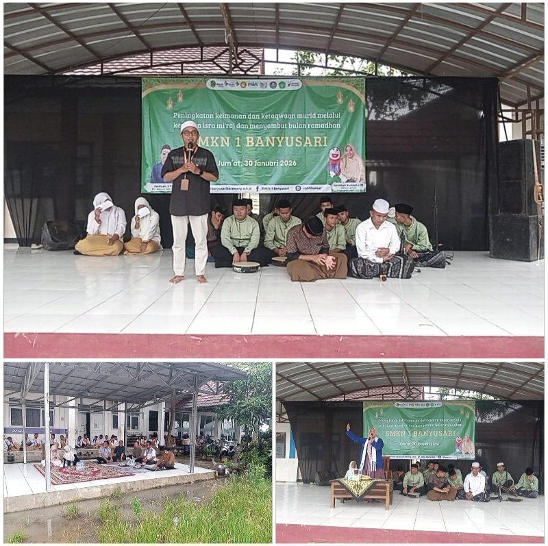 KARAWANG – SMKN 1 Banyusari, Kabupaten Karawang, menggelar peringatan Isra Mi’raj Nabi Muhammad SAW sekaligus menyambut datangnya bulan suci Ramadhan, Jumat (30/01/2026). Kegiatan keagamaan tersebut berlangsung khidmat dan penuh makna bertempat dihalam sekolah dengan menggandeng Badan Wakaf Al-Qur’an (BWA) Karawang untuk program pemberian Al-Qur’an ke wilayah Aceh.