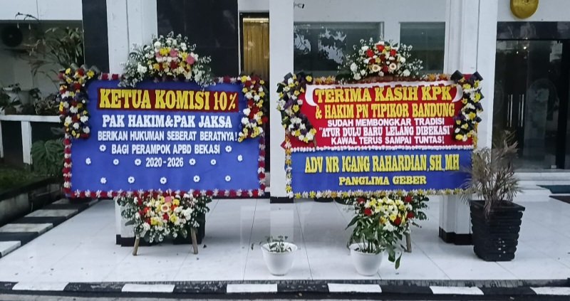 ​”Terima kasih KPK & Hakim PN Tipikor Bandung sudah membongkar tradisi ‘Atur Dulu Baru Lelang di Bekasi’. Kawal terus sampai tuntas!” demikian bunyi pesan yang tertulis pada karangan bunga tersebut. Rabu 8/4/2026