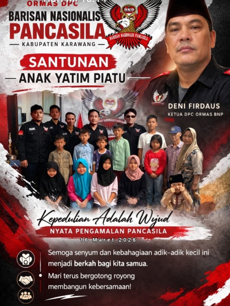 KARAWANG — Ormas Barisan Nasional Pancasila (BNP) Dewan Pimpinan Cabang (DPC) Kabupaten Karawang kembali menunjukkan kepedulian sosialnya dengan menggelar kegiatan santunan kepada anak yatim piatu pada Senin, 16 Maret 2026. Kegiatan yang berlangsung penuh kehangatan tersebut menjadi bukti nyata komitmen BNP dalam mengamalkan nilai-nilai luhur Pancasila di tengah kehidupan bermasyarakat.