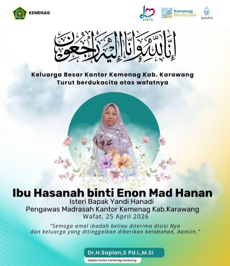 KARAWANG – Kabar duka menyelimuti keluarga besar Kantor Kementerian Agama (Kemenag) Kabupaten Karawang. Telah berpulang ke rahmatullah Hasanah binti Enon Mad Hanan, istri dari Yandi Hanadi selaku Pengawas Madrasah, pada Sabtu, 25 April 2026.