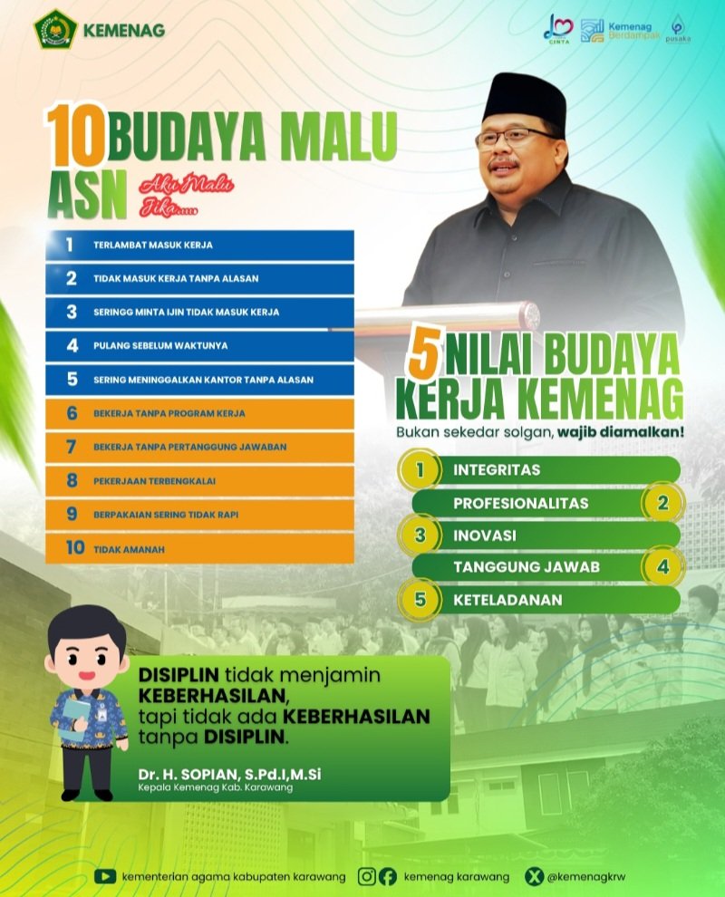Adapun 10 Budaya Malu ASN yang ditekankan untuk diamalkan di lingkungan MTsN 1 Karawang antara lain: