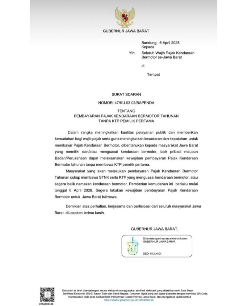 BANDUNG – 6 April 2026. Gubernur Jawa Barat, Dedi Mulyadi, resmi menerbitkan surat edaran terbaru terkait kemudahan pembayaran Pajak Kendaraan Bermotor (PKB) tahunan bagi masyarakat di wilayah Jawa Barat.