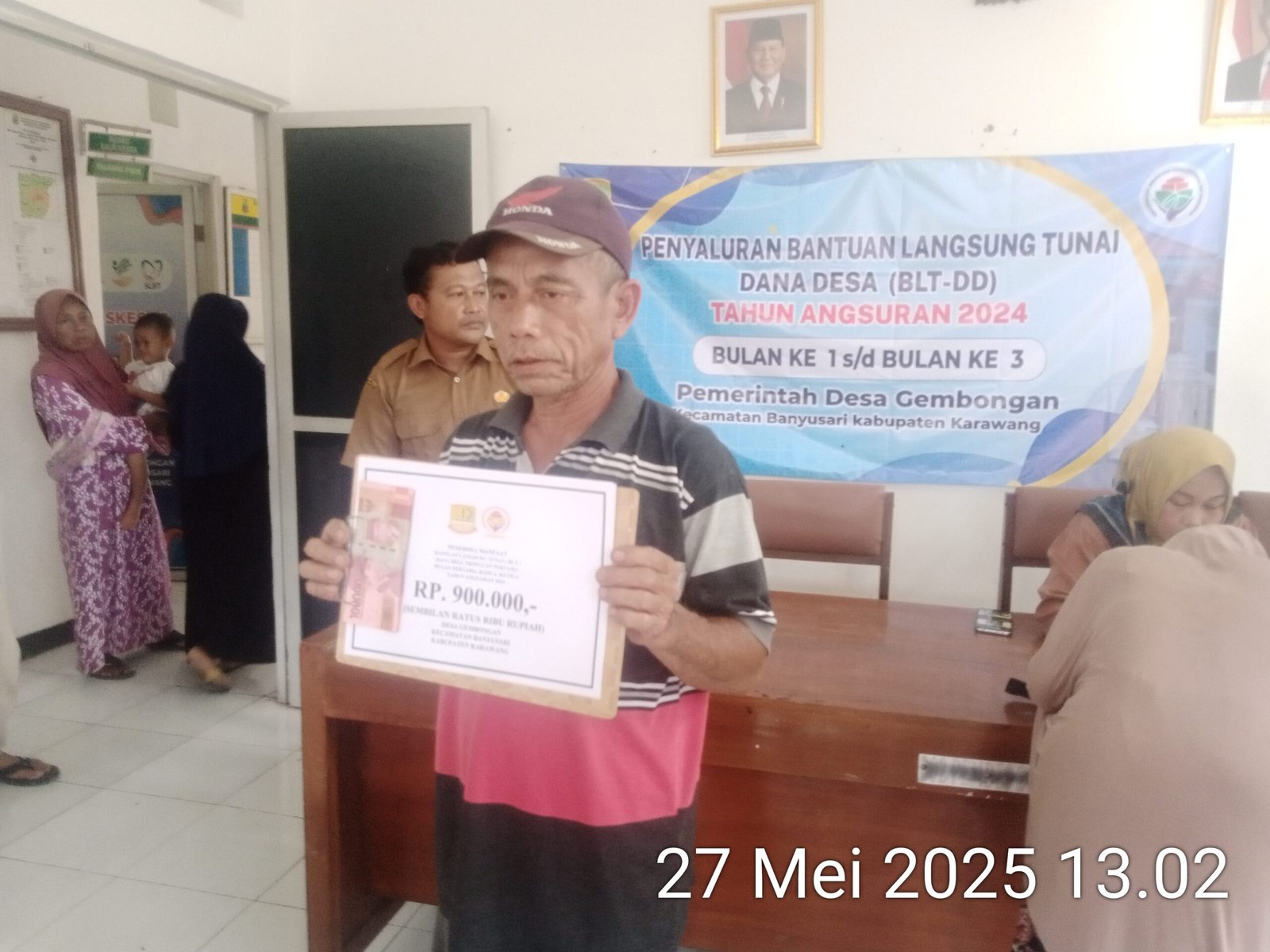 KARAWANG // LINGKARKARAWANG – Pemerintah Desa Gembongan Kecamatan Banyusari Kabupaten Karawang telah menyalurkan Bantuan Langsung Tunai (BLT) Dana Desa tahap pertama tahun 2025. Penyaluran BLT ini mencakup periode Januari, Pebruari, Maret dan dilaksanakan pada hari Selasa tanggal 27 Mei 2025.