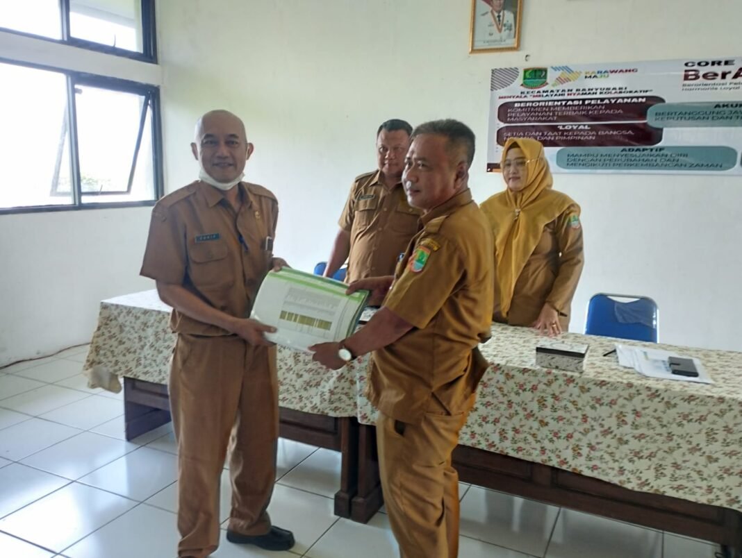 KARAWANG – Pemerintah Kecamatan Banyusari, Kabupaten Karawang, melaksanakan serah terima tugas pokok dan fungsi (tupoksi) Kepala Seksi Pelayanan Umum (Kasi Yanum) dari Sarif Andrayana, S.Kep., M.AP kepada Kepala Seksi Pemerintahan (Kasipem) Ena Mulyana, SE. Kegiatan tersebut dilaksanakan dalam rapat minggon kecamatan yang bertempat di Aula Kantor Kecamatan Banyusari, Selasa (6/1/2025).