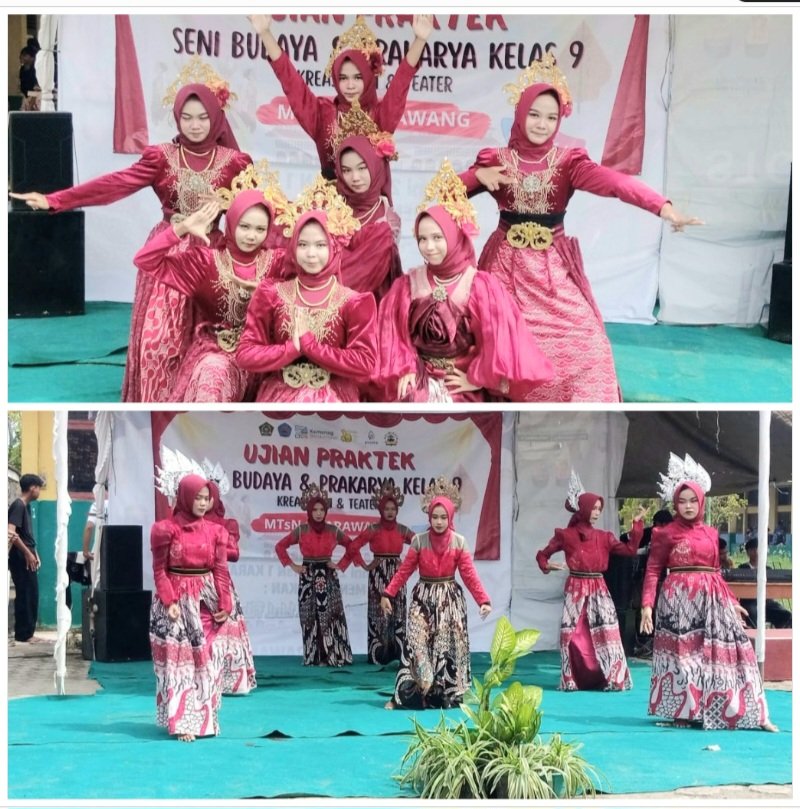 Dalam kegiatan ujian praktik tersebut, para siswa kelas IX tampil memukau dengan memperlihatkan beragam keahlian di bidang seni, mulai dari tari tradisional hingga pementasan drama. Setiap penampilan disuguhkan dengan penuh penghayatan, didukung oleh busana yang menarik, riasan yang sesuai karakter, serta gerak dan ekspresi yang mencerminkan hasil latihan yang matang.
