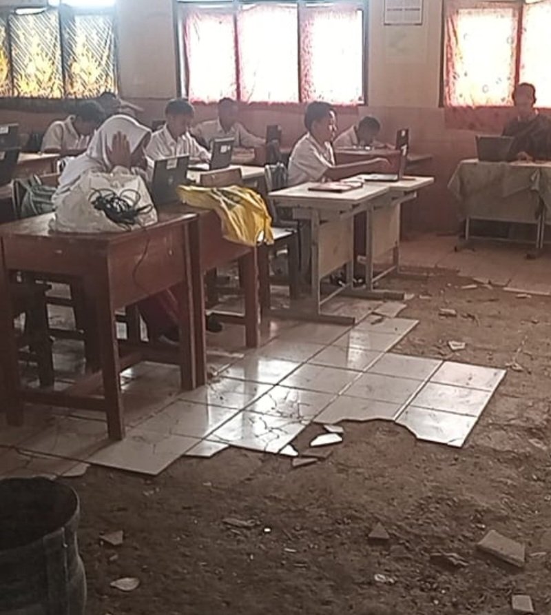 Berdasarkan pantauan di lokasi, ruang kelas yang digunakan untuk pelaksanaan gladi TKA tampak mengalami kerusakan pada bagian lantai.