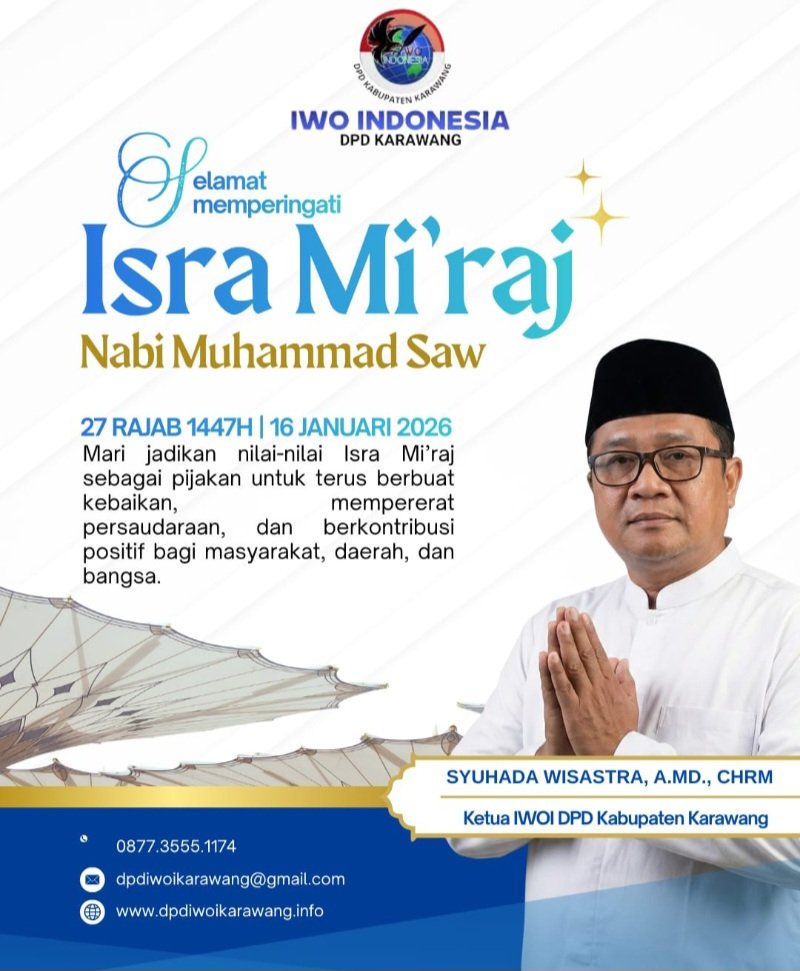 Ketua Ikatan Wartawan Online Indonesia (IWO Indonesia) DPD Kabupaten Karawang, Syuhada Wisastra, A.Md., CHRM, dalam pernyataannya menyampaikan ucapan Selamat Memperingati Isra Mi’raj Nabi Muhammad SAW 16 Januari 2026 / 1447 H kepada seluruh umat Islam, khususnya insan pers di Kabupaten Karawang dan Indonesia pada umumnya.